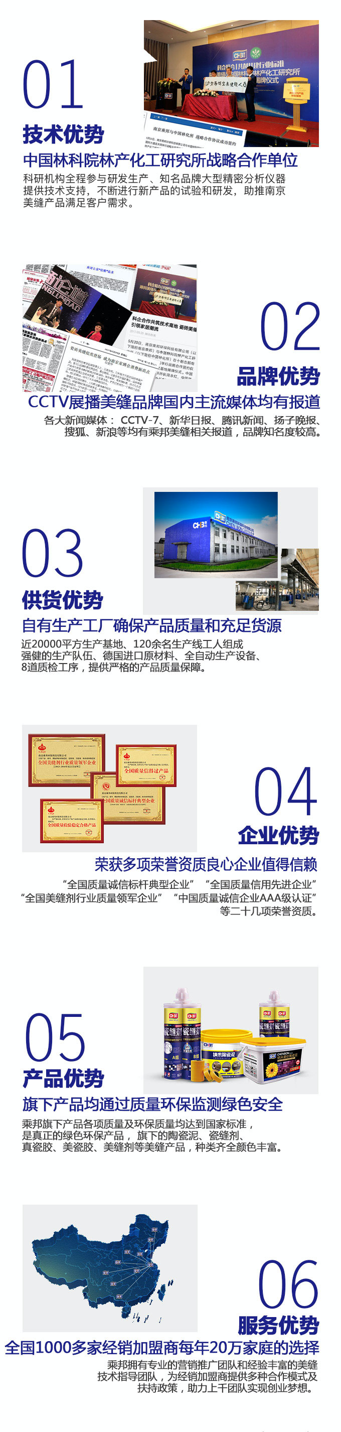 南京乘邦環(huán)保科技有限公司成立于2005年,是集南京瓷磚美縫南京美縫施工、高科技產(chǎn)品的研發(fā)與銷&售等產(chǎn)業(yè)的南京瓷磚美縫公司。目前公司主打美縫產(chǎn)品為國內(nèi)推出的傳統(tǒng)美縫劑升級(jí)產(chǎn)品:乘邦納米陶瓷泥、水性環(huán)氧彩砂,天然砂質(zhì)顏料,化妝品般安全無污染。乘邦陶瓷泥顏色豐富,大大提升裝飾效果,打造魔幻家居,讓家也可以炫酷起來。它綠色環(huán)保防霉防污,堅(jiān)硬如瓷細(xì)膩光潔,不僅做到瓷磚縫隙“不變黑”,而且在為每一個(gè)家庭健康美麗而努力,這是乘邦公司的最高準(zhǔn)則,也是乘邦人為之努力奮斗的目標(biāo),以此目標(biāo)乘邦本著"誠信、合作、專業(yè)、超越"的理念,詮釋優(yōu)質(zhì)服務(wù),演繹品質(zhì)生活。同時(shí)公司擁有一支管理完善、經(jīng)驗(yàn)豐富的專業(yè)美縫施工隊(duì)伍。在南京瓷磚美縫價(jià)格方面也有很大的優(yōu)勢,每年為南京近萬家庭提供美縫服務(wù),其自主研發(fā)的乘邦牌產(chǎn)品在10余省市已有近千個(gè)代理商,在全國范圍內(nèi)享有很高的知名度。